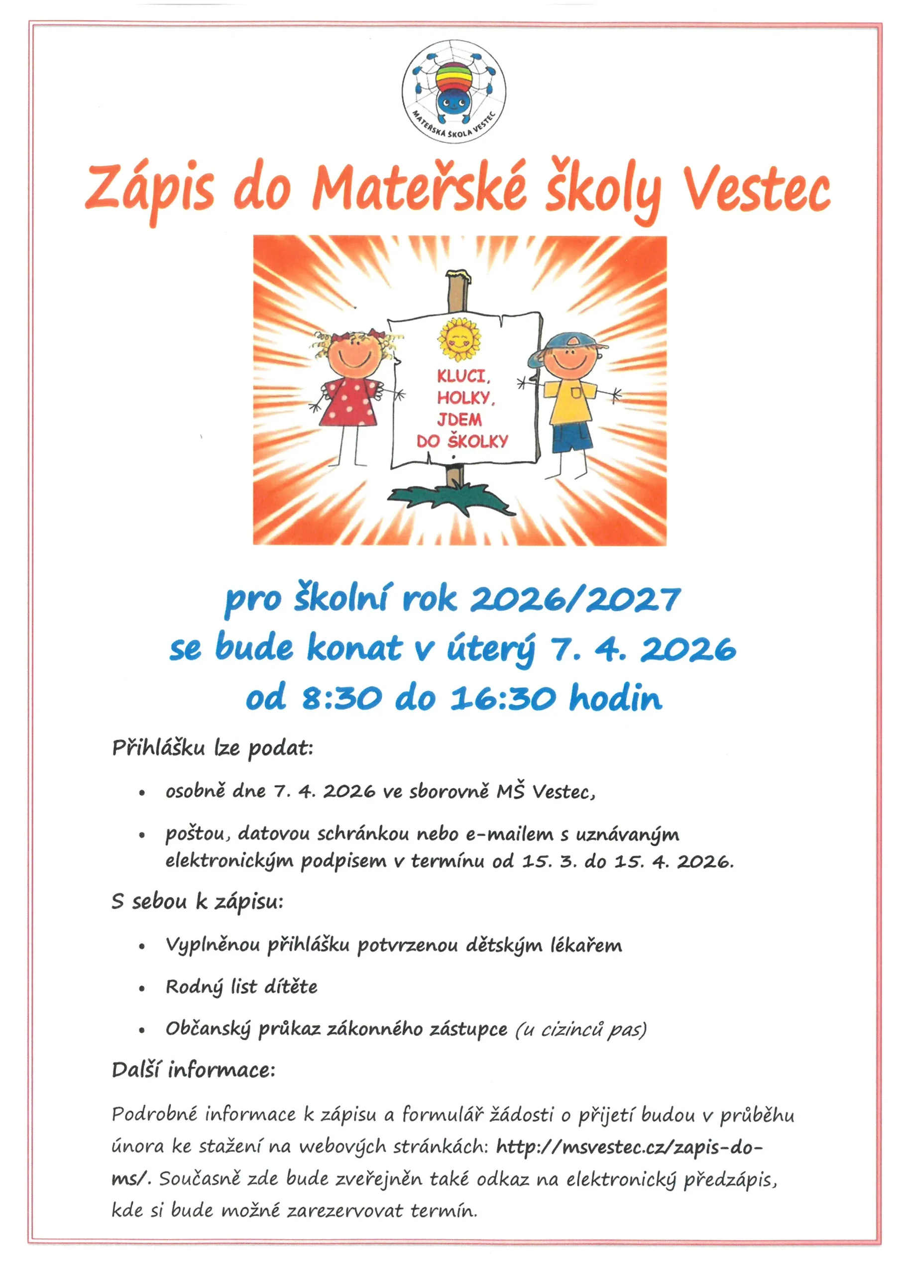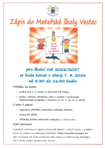 Zápis do Mateřské školy Vestec pro školní rok 2026/2027